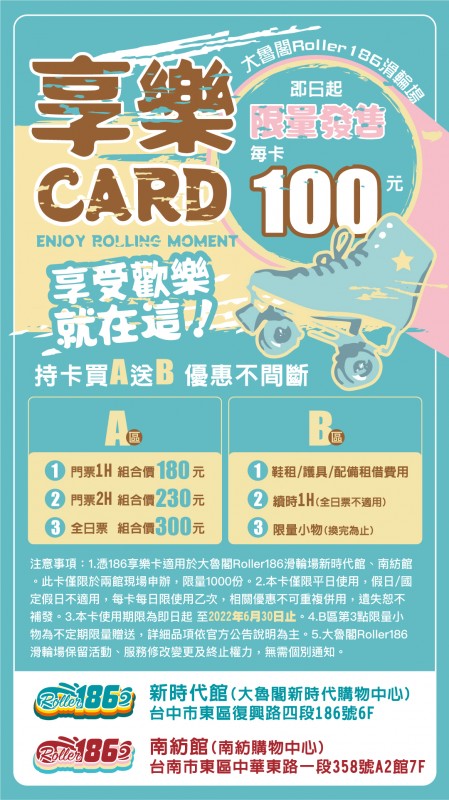 首頁 最新消息 【Roller186滑輪場】186享樂卡限量登場!持卡買A送B優惠不間斷 2022.01.03 優惠活動 【Roller186滑輪場】186享樂卡限量登場!持卡買A送B優惠不間斷 ★2022年1月3日起限量發售★ 分享此篇文章 更多消息 2022.01.10 優惠活動 【大魯閣APP電子代幣~多打多送】1/25前現場使用滿11枚代幣,即可兌換13張當日電子券! 2021.12.30 綜合 【Roller186滑輪場南紡館】元旦DJ趴強勢登場! 2021.12.21 優惠活動 【棒壘、保齡】聖誕跨年慶