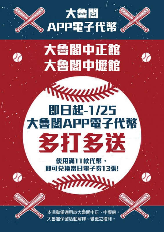 首頁 最新消息 【大魯閣APP電子代幣~多打多送】1/25前現場使用滿11枚代幣,即可兌換13張當日電子券! 2022.01.10 優惠活動 【大魯閣APP電子代幣~多打多送】1/25前現場使用滿11枚代幣,即可兌換13張當日電子券! 【大魯閣APP電子代幣~多打多送】【活動日期】即日起至1/25止。【活動場館】大魯閣桃園中正館、中壢館限定。【活動內容】大魯閣中正館/中壢館【111專屬活動】2022/1/11起至場館進行登記並使用大魯閣11枚代幣,即可兌換13枚當日使用代幣優惠,若加入大魯閣會員APP,額外可再加贈2枚,優惠只到2022/1/25喔! 分享此篇文章 更多消息 2022.01.11 綜合 【Roller186滑輪場南紡館】最躁DJ趴強勢登場! 2022.01.03 優惠活動 【Roller186滑輪場】186享樂卡限量登場!持卡買A送B優惠不間斷 2021.12.30 綜合 【Roller186滑輪場南紡館】元旦DJ趴強勢登場!