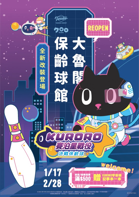 首頁 最新消息 【土城保齡球限定】KURORO宇宙喵 REOPEN開幕滿額贈 2022.01.17 優惠活動 【土城保齡球限定】KURORO宇宙喵 REOPEN開幕滿額贈 【土城館】贈品數量有限,送完為止! 分享此篇文章 更多消息 2022.01.18 優惠活動 【500滿額贈】新春好禮多重送,樂天女神春聯、純電卡丁車現金抵用券、2022年曆海報、KURORO宇宙喵記事本通通送給你 2022.01.14 優惠活動 【學生專屬】1/17-1/28百元暢打又來囉~! 2022.01.11 綜合 【Roller186滑輪場南紡館】最躁DJ趴強勢登場!