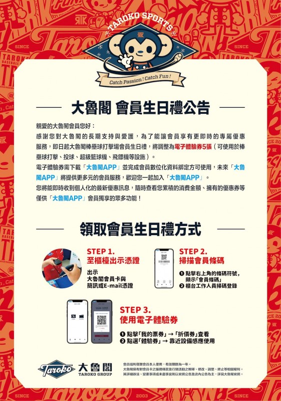 感謝您對大魯閣的長期支持與愛護,為了能讓會員享有更即時的專屬優惠服務,即日起大魯閣棒壘球打擊場會員生日禮,將調整為【電子體驗券5張】(可使用於棒壘球打擊、投球、超級籃球機、飛鏢機等設施)。