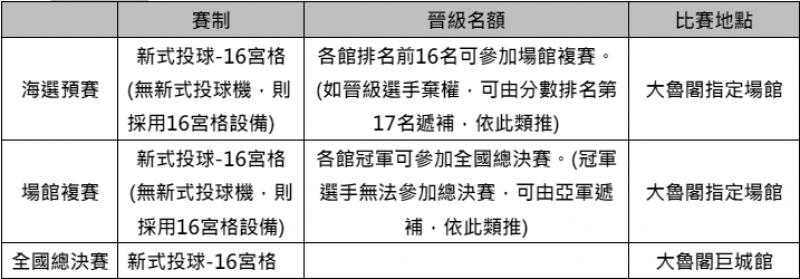 1. 本次比賽以使用大魯閣新式電子螢幕投球機進行比賽;如參賽場館無新式電子螢幕投球機,則以16宮格投球機(含規責)進行參賽;總決賽以新式電子螢幕投球機為指定機台。