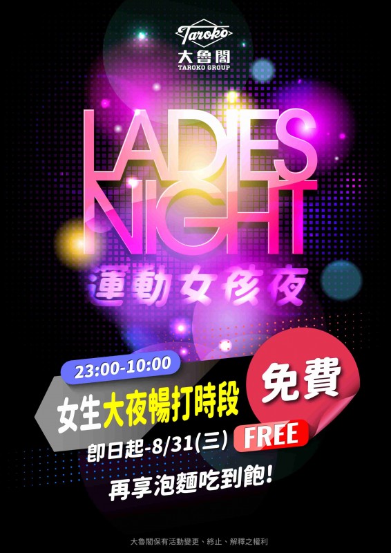 首頁 最新消息 【24小時營業場館限定】Lady’s NIGHT 運動女孩夜 2022.07.15 優惠活動 【24小時營業場館限定】Lady’s NIGHT 運動女孩夜 大魯閣新莊館 │ 大魯閣中正館 │ 大魯閣中壢館 │大魯閣嘉義館 │ 大魯閣中華館【24小時營業場館限定】Ladies NIGHT 運動女孩夜 7/15(五)-8/31(三) 每日2300-隔日1000女生大夜暢打時段 免費入場,再享泡麵吃到飽!※大魯閣保有活動變更、終止、解釋之權利。 分享此篇文章 更多消息 2022.07.15 賽事活動 【大魯閣中壢館】壘球打擊挑戰賽,參賽就有機會免費入住五星級華航諾富特飯店。 2022.07.11 優惠活動 【狂賀!樂天桃猿上半季封王】樂天桃猿球迷免費入會、免費打 2022.07.01 優惠活動 【棒壘球年中慶】Taroko x Rakuten最強聯名之夏之野球祭,代幣最低58折!