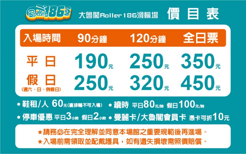 3. 如有未盡事宜依照現場工作人員說明為主,大魯閣Roller186滑輪場保有活動最終解釋、說明、修改之權利
