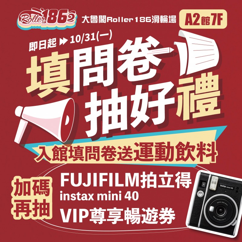 大魯閣Roller186滑輪場南紡館 │填寫問卷送運動飲料、加碼再抽「FUJIFILM instax mini 40拍立得」和「VIP尊享暢遊券」等好禮