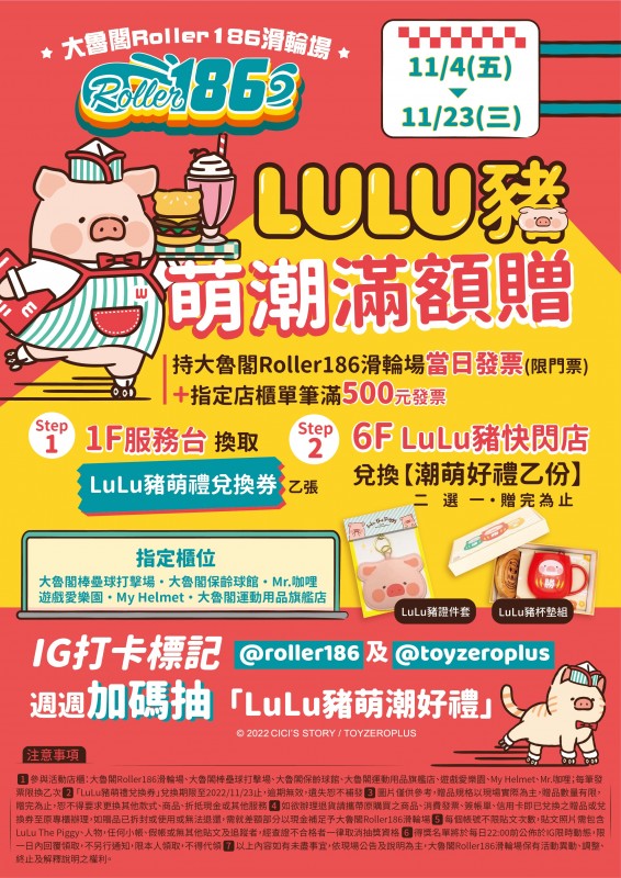 1. 參與活動店櫃:大魯閣Roller186滑輪場、大魯閣棒壘球打擊場、大魯閣保齡球館、大魯閣運動用品旗艦店、遊戲愛樂園、My Helmet、Mr.咖哩;每筆發票限換乙次。2. 「Lulu豬萌禮兌換券」兌換期限至2022/11/23止,逾期無效,遺失恕不補發3.圖片僅供參考,贈品規格以現場實際為主,贈品數量有限,贈完為止,恕不得要求更換其他款式、商品、折抵現金或其他服務4.如欲辦理退貨請攜帶原購買之商品、消費發票、簽帳單、信用卡即已兌換之贈品或兌換券至原專櫃辦理,如贈品已拆封或使用或無法退還,需就差額部分以現金補足予大魯閣Roller186滑輪場5.每個帳號不限貼文次數,貼文照片需包含Lulu The Peggy、人物,任何小帳、假帳或無其他貼文及追蹤者,經查證不合格者一律取消抽獎資格 2. 得獎名單將於每日22:00前公佈於IG限時動態,限一日內回覆領取,不另行通知,限本人領取,不得代領 6.5.以上內容如有未盡事宜,依現場公告及說明為主,大魯閣Roller186滑輪場保有活動異動、調整、終止及解釋說明之權利。