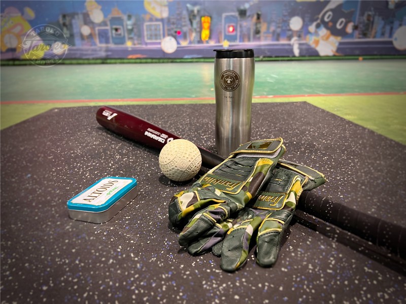 Daniel每次來大魯閣必備的隨身小物,代幣鐵盒、專屬球棒、打擊手套、水壺。
