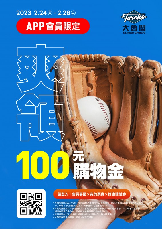 1.本抵用券限2023年2月19日前註冊大魯閣APP之會員使用,適用於全國大魯閣棒壘球、保齡球、卡丁車場(汐止運動中心館、中壢運動中心館不適用)。