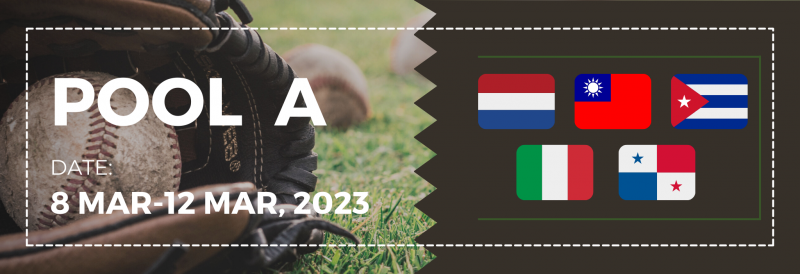 【A組】台灣、荷蘭、古巴、義大利、巴拿馬,In台灣台中洲際棒球場 比賽時間 : 03/08(三)-03/12(日)