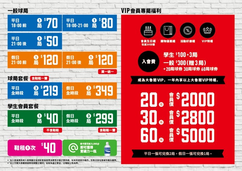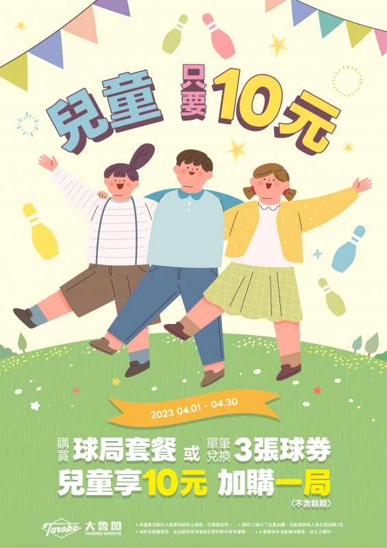 首頁 最新消息 【保齡兒童月】兒童只要10元 2023.04.01 優惠活動 【保齡兒童月】兒童只要10元 親子同樂!兒童只要10元2023/04/01(六)至2023/04/30(日)購買球局套餐 或 單筆兌換3張球券,兒童享10元加購一局 (不含鞋租)可以去哪玩? 【土城館】|【花蓮館】保齡球價目表:注意事項: 本優惠活動於大魯閣保齡球土城館、花蓮館使用。 僅限12歲以下兒童加購,活動期間每人每日限加購1局。 須配合親屬開局,並由開局者現場登記資料即可享有優惠。 大魯閣保有活動修改變更、終止之權利。 分享此篇文章 更多消息 2023.04.01 優惠活動 【期間限定】代幣輕鬆續,會員續卡不用100元! 2023.04.01 優惠活動 【保齡】銅板加價購 2023.03.21 綜合 【2023經典賽跟大魯閣一起瘋棒球】經典賽中華隊門票免費抽看這篇,經典賽時期如何跟上棒球熱潮?WBC賽程表/賽事結果/分組名單/中華隊場次售票資訊/門票抽獎