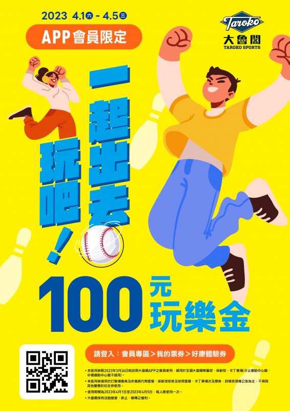 1.本抵用券限2023年3月26日前註冊大魯閣APP之會員使用,適用於全國大魯閣棒壘球、保齡球、卡丁車場(汐止運動中心館、中壢運動中心館不適用)。