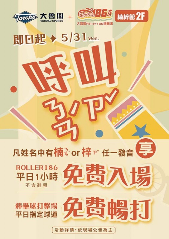 活動時間:4/17(一)~5/31(三),大魯閣Roller186滑輪場楠梓館限定