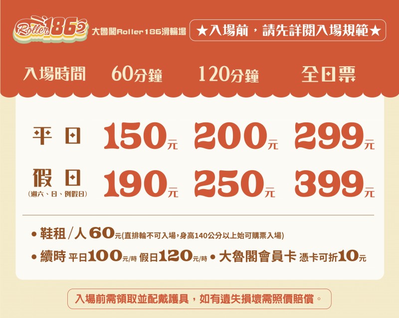 1.本活動限大魯閣Roller186滑輪場楠梓館及本人使用,不可與其他專案優惠併用。