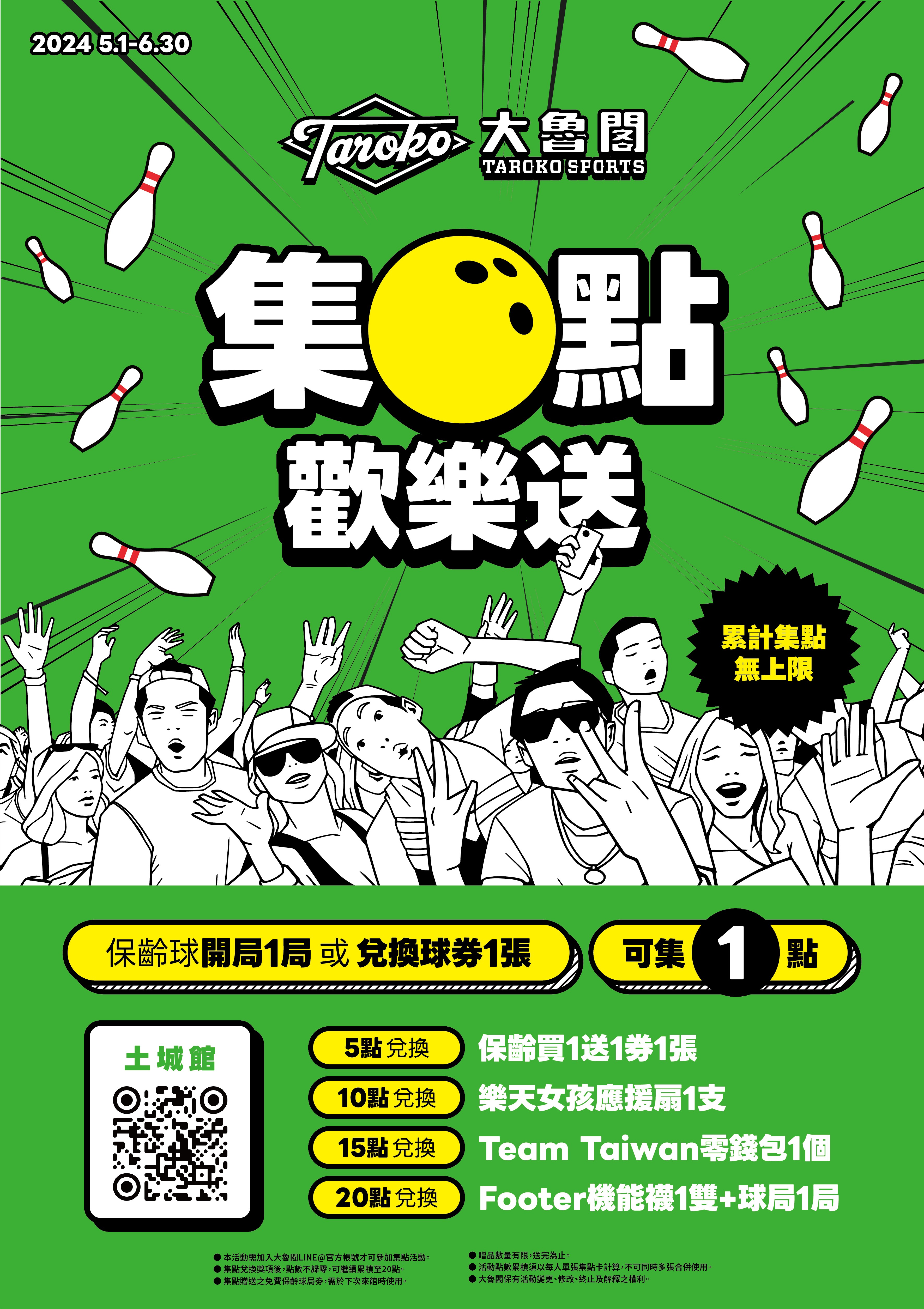 活動內容:掃描領取集點卡,保齡球開局1局或兌換球券1張,可集1點 ,累計集點無上限!