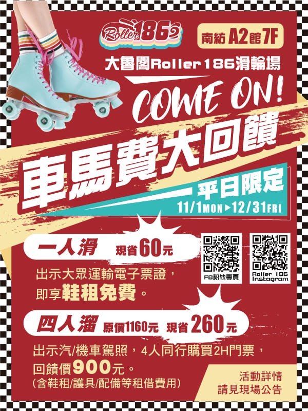 首頁 最新消息 【Roller186】南紡限定,車馬費大回饋 2021.10.26 優惠活動 【Roller186】南紡限定,車馬費大回饋 【Roller186滑輪場南紡館搶先看!】 全場地將近600坪,主打美式復古風格,流線的經典紅色元素搭配黑白相間的棋盤式地板,絢爛的霓虹燈條點綴全場,創造網美、網帥專屬的拍照打卡聖地! >>超夯必拍亮點主題: ❤️魔幻超時空隧道 ❤️美式復古餐廳 ❤️滾筒洗衣機牆 ❤️沙龍理髮廳>>點點連結了解更多! ⊙FB粉專:https://www.facebook.com/Roller186TS ⊙IG帳號:https://www.instagram.com/roller186/ △ 注意事項1. 參加本活動請主動出示指定證件,如遇續時需依續時原價計算。各項優惠皆不合併使用,亦不可與其他票券或專案優惠併用。 2. 因應疫情警戒,容留人數配合疫情措施調整。 3. 以上內容如有未盡事宜,依現場公告為主,本公司保有活動解釋說明之權利。 分享此篇文章 更多消息 2021.10.27 綜合 【得獎公告】2021大魯閣問券抽獎活動,得獎名單公告! 2021.10.26 優惠活動 【Roller186】超級玩家日,接龍大解放 2021.10.22 優惠活動 【保齡球】花蓮夜貓子集合~深夜時段1局30元。